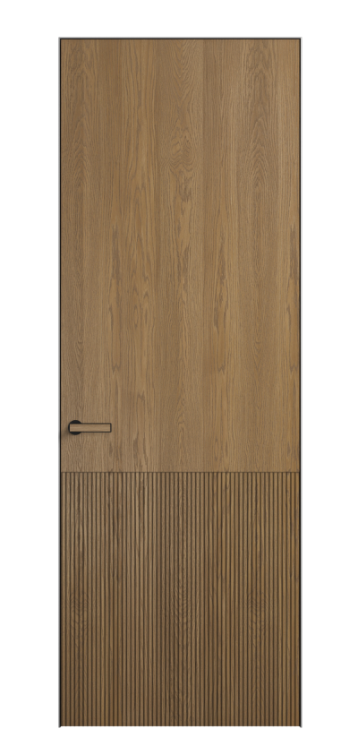 Это полотна с рельефной фрезеровкой. Этот прием делает интерьер объемным, тактильным, вносит интересную текстуру и создает современный образ. Волнистый рельеф может быть выполнен по ламелям из массива дуба в древесных матовых отделках, либо исполнен по натуральному и экологически безопасному материалу — ХДФ, покрытому гладкой эмалью актуальных оттенков.